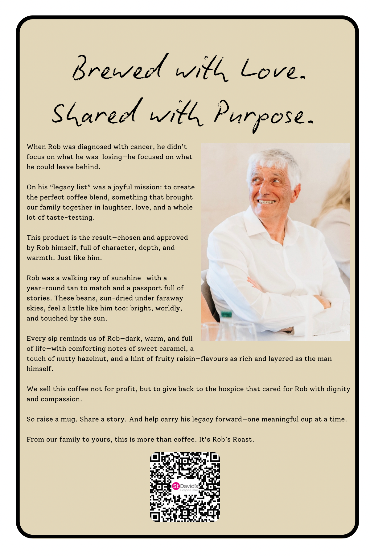Rob’s Roast originated from a love of great coffee and the memory of Robin, a devoted husband, father, grandad, and teacher who cherished life’s simple joys. The perfect blend was crafted to honour his legacy with each sip.